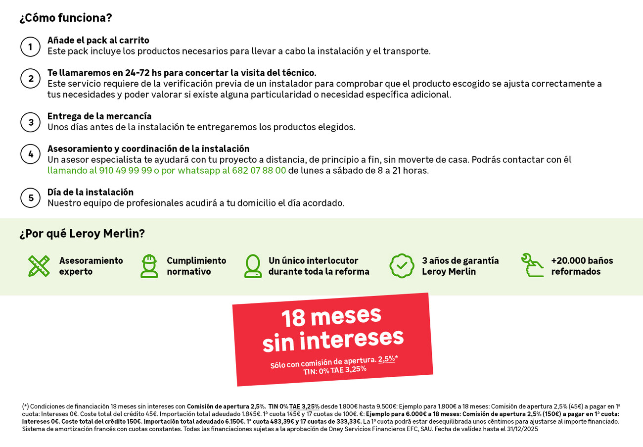 El precio final incluye productos, servicios de instalación, transporte e IVA. El precio indicado incluye hasta un radio de 30km desde la tienda más cercana. Retirada a punto limpio no incluida (consulta condiciones en tienda).